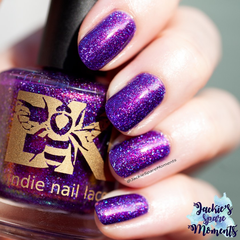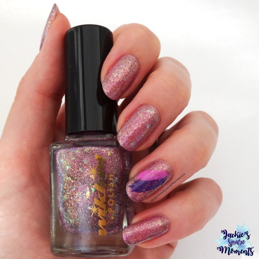 Ik startte de maand met een oude nagellak. Deze lijn van Rimmel vond ik erg fijn toen hij nog te koop was. Ik draag Urban purple in twee laagjes. Ik had zin om wat te experimenteren met toppers. Dus ik bracht eerst een laagje Colores de Carol Flame aan en daarover een dun laagje KBShimmer Out of Sequins. Ik heb in een klein 5 ml nagellak potje wat heldere nagellak gemixt met KBShimmer Out of Sequins om de reflective glitter wat te verdunnen. Was erg tevreden met het resultaat.