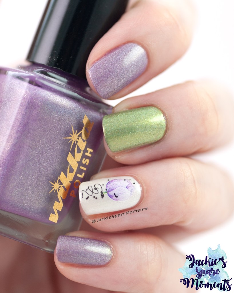 Nadat Amanda @TheNailPolishHound een video met paarse holografische nagellakken uit haar collectie had geüpload, was ik geïnspireerd om een paarse holografische nagellak uit mijn collectie te gebruiken. Ik koos voor Wikkid polish Parma Violets (drie laagjes) en waterslide decals van AliExpress. Om het af te maken voegde ik nog Wikkid polish Pistachio (twee laagjes) en Catrice Brave metallics 02 Sweet as sugar (twee laagjes) toe. Het resultaat was paarse en groene holografische nagels met witte accent nagel met decal. Ik vond het een heel geslaagde manicure!