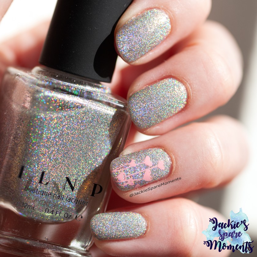 Daarna droeg ik ILNP Flower Child. Dit is een roze nagellak met een sterke blauwe shimmer en holografische glitter. Ik kreeg het dekkend genoeg in drie laagjes. De blauwe shimmer veranderd naar paars als het licht onder een ander hoek op je handen valt. Ik kreeg een aantal complimentjes toen ik deze manicure droeg.