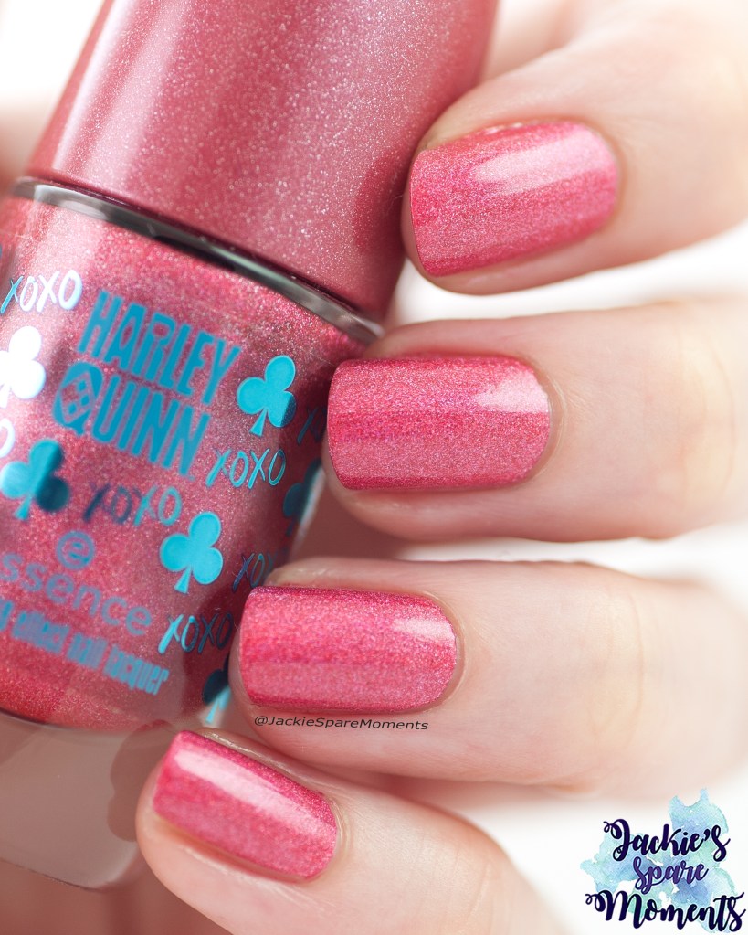 X is for XOXO, Harley. This is my only nail polish starting with X. But that is not the whole story. I only wore this polish as a pedicure and would love to wear it as a manicure too. It’s a beautiful reddish pink holographic nail polish by essence.
