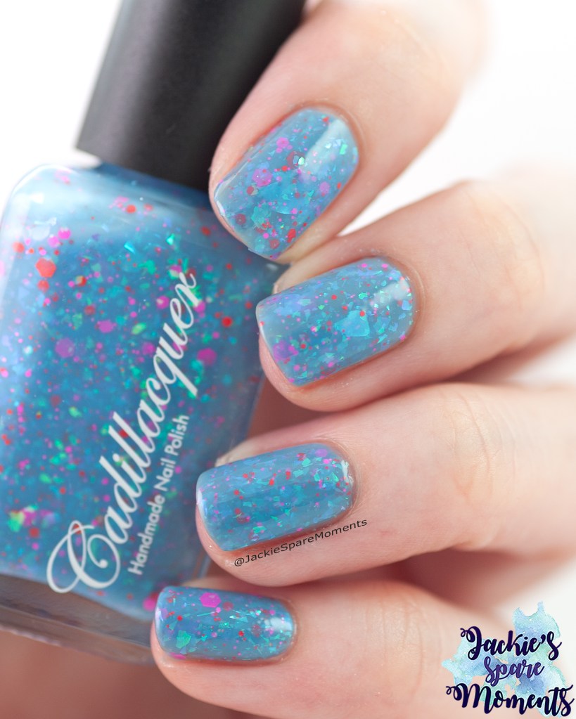 Cadillacquer Positive Thinking is a new nail polish in my collection. Because of the name and the fun glitter and flake mix in this blue base colour, I wanted to wear right away. I wear it in three coats with glitter smoothing top coat and a regular top coat.