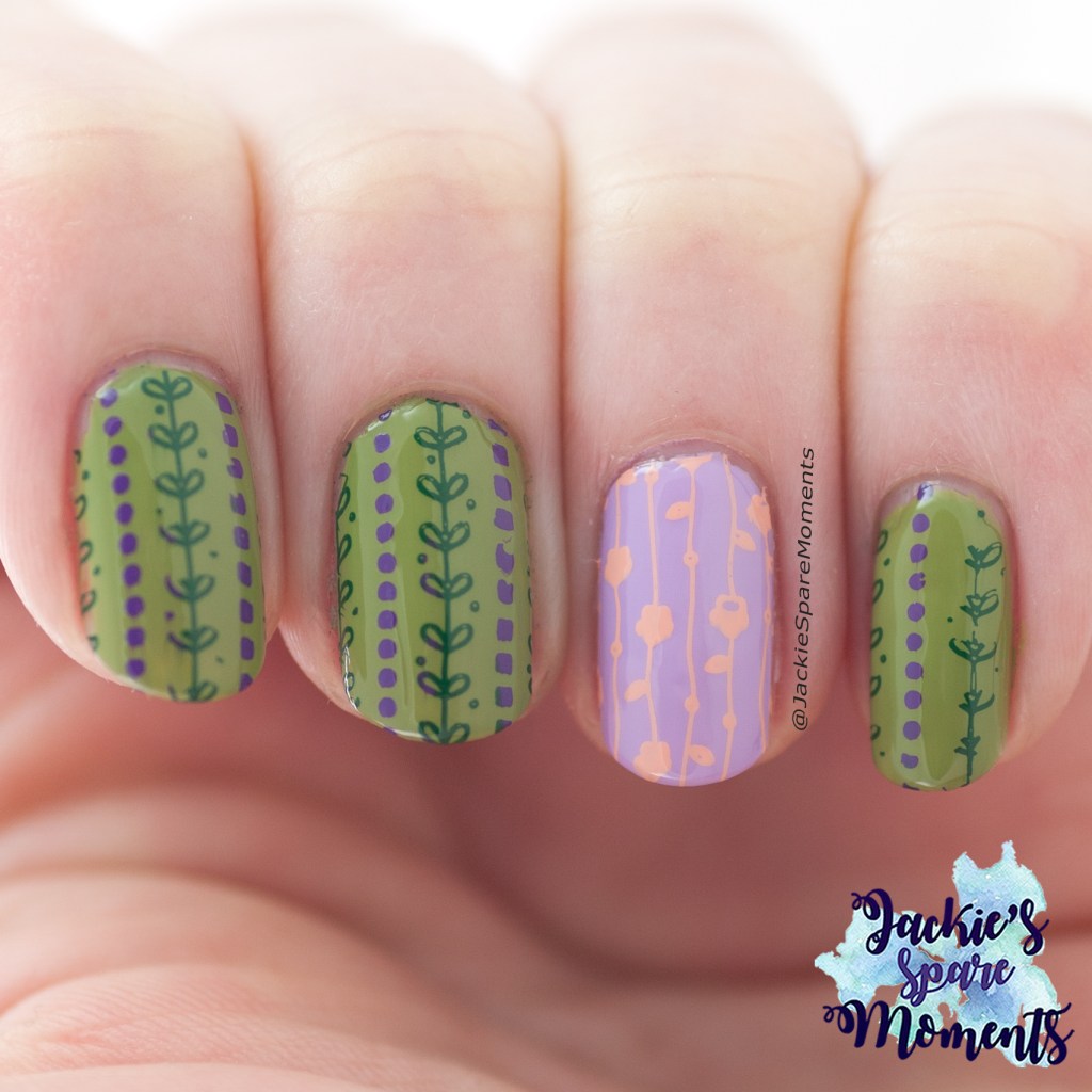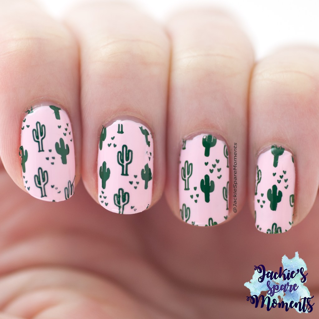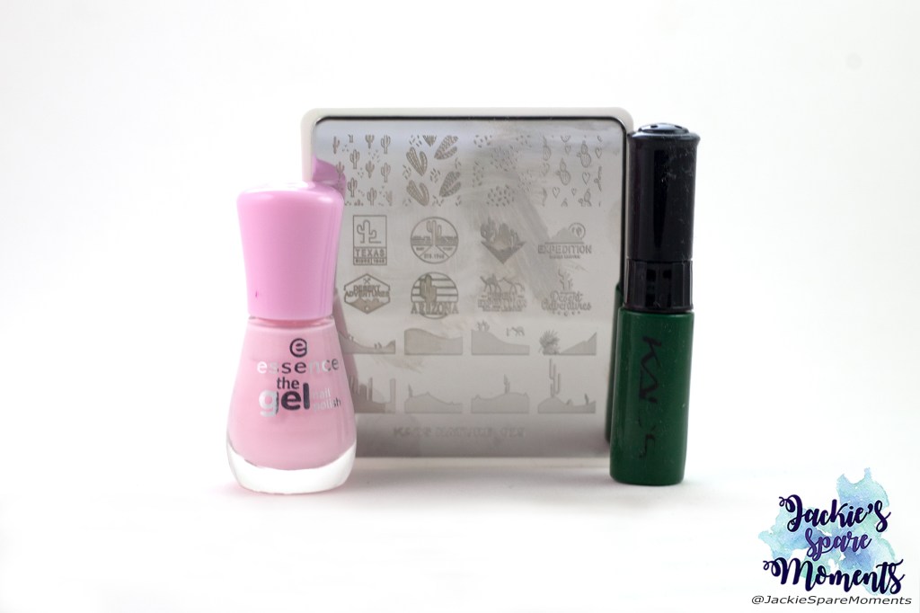 As base I used essence 55 be awesome tonight! I painted two coats for full coverage. It’s an older polish, but I still love using it. On top I stamped an image with cactuses and small hearts with a dark green stamping polish by KADS.